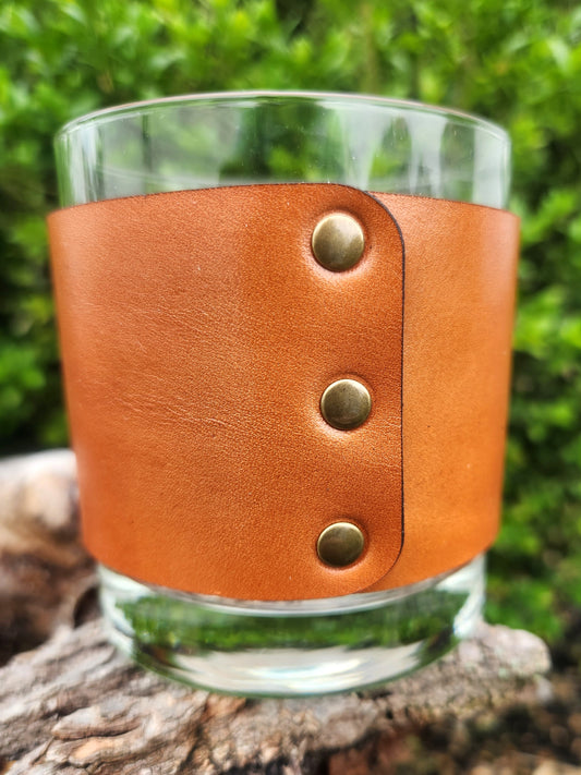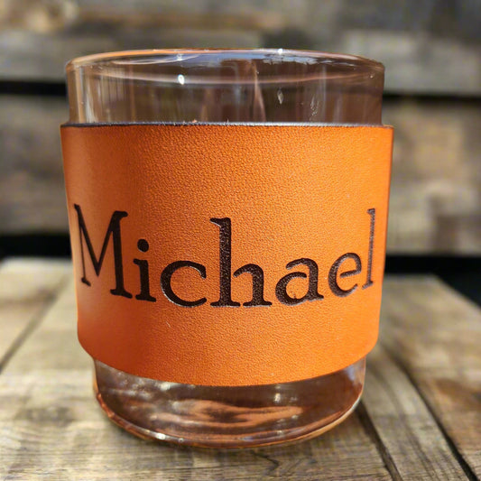 Bourbon glass with engraved Leather wrap - Custom Barware