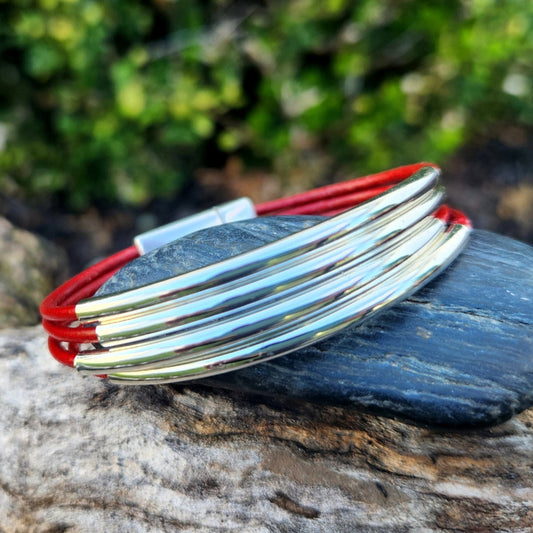 Silver Bars Leather Bangle bracelet