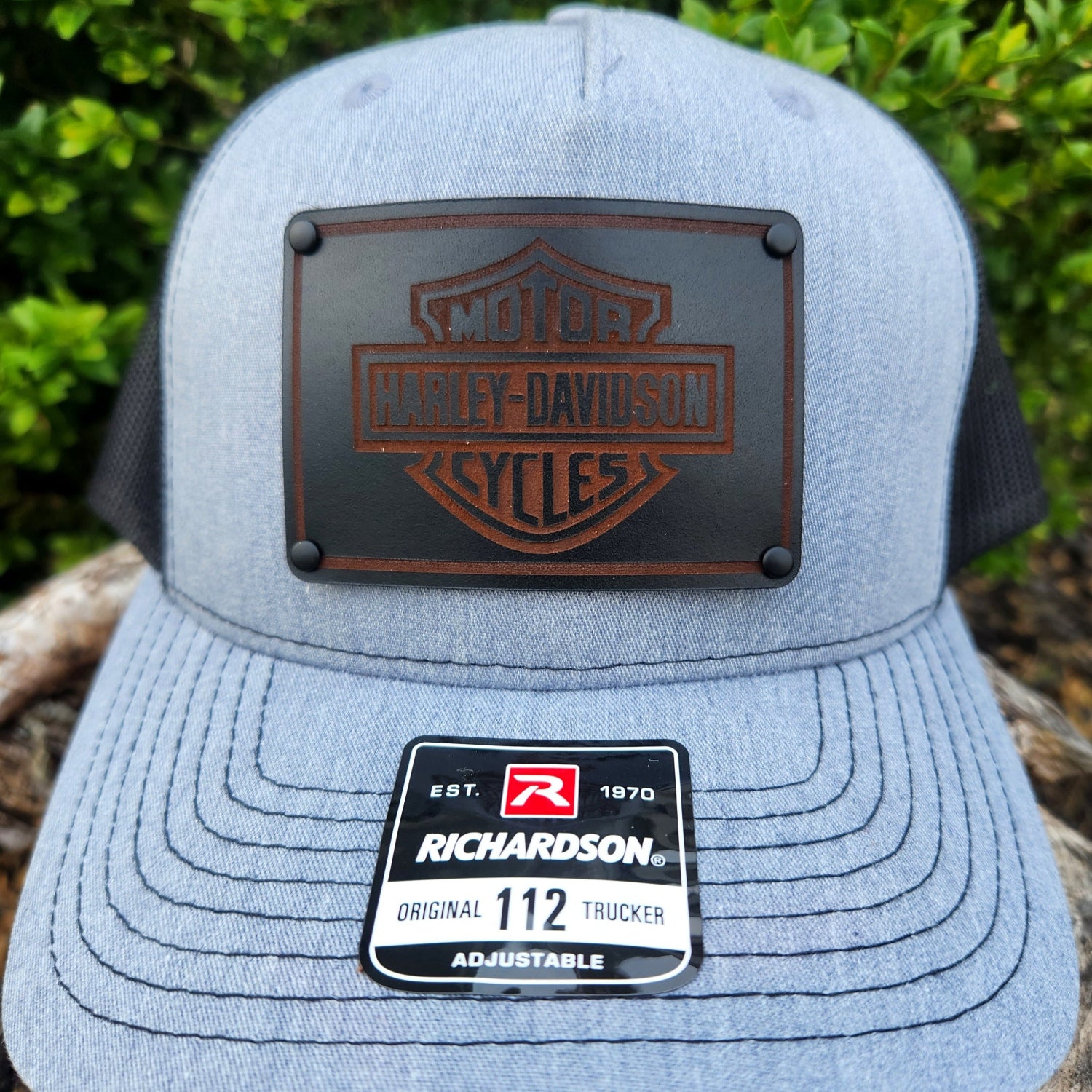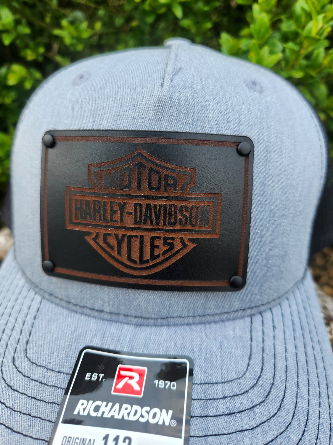 Riding hat - Motorcycle rider hat - Biker Harley hat design engraved into full grain Black leather patch for a new vibe on a classic